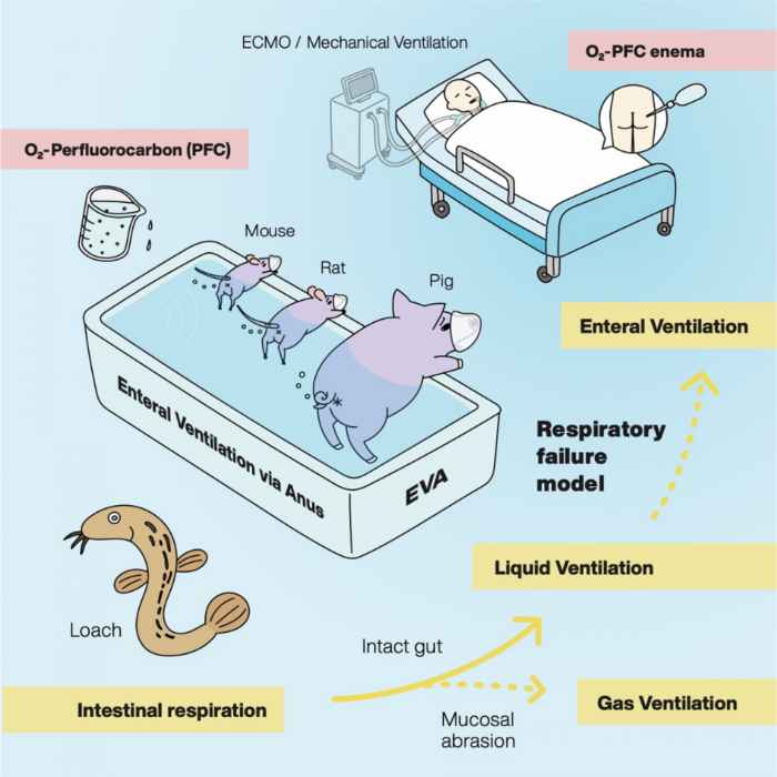 这项研究涉及开发一个肠道气体通气系统,该系统被用来通过直肠将纯氧泵入小鼠的肠道。这些小鼠被放置在一个极度低氧的环境中,这是一个在没有补充氧气的情况下会导致死亡的环境,而75%的小鼠在肠道呼吸装置的作用下生存了50分钟。