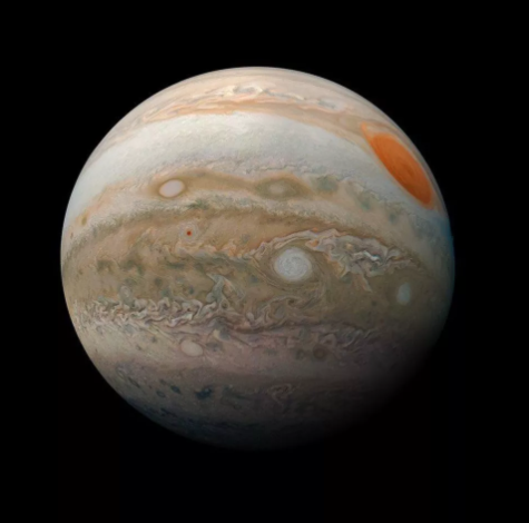 朱诺号的近距离飞掠让我们看到了这个星球的南半球,包括一个著名“大红斑”的侧面“目击”,“大红斑”直径约是地球直径的两倍。