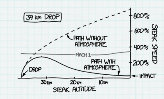 而在100km下落时,牛排会加速到2马赫速度,能将表面烤焦,但平流层的冷风又会将牛排冷却,所以可能会得到一块只熟了一点儿的牛排。